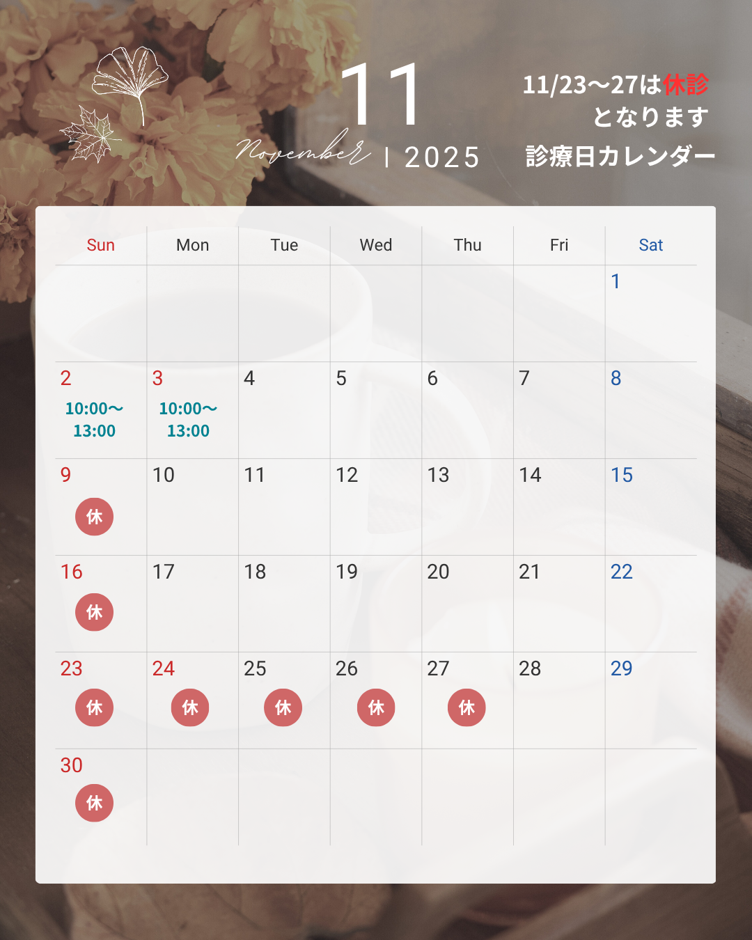 | 10:00~13:00 | ● | ● | ● | ● | ● | ● | 休 |